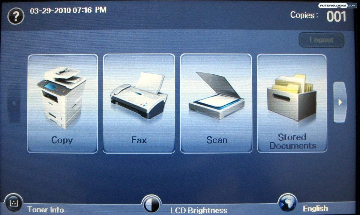 Through the menu, you can set access the copy, fax, and scan features, as well as get to the stored documents, setup menu, toner info, LCD brightness, and more. The network setup is performed through the touchscreen as well. You go to the IP settings and enter the information manually using the (hardware) numeric keypad. Since it uses a static IP, I’d suggest you use one at the upper end of your router’s IP range so that you don’t get any duplication errors. I speak from experience.