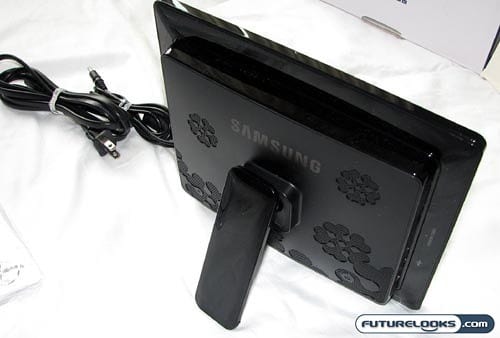 Aside from the digital frame itself, you get a USB cable for connecting the frame to your computer, the power brick and cable for connecting to the wall, the ball joint-style stand, installation CD, and supporting documentation.