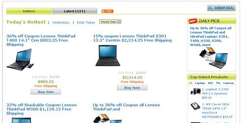 On a side note, you’ll also notice that all outbound links from LogicBUY are redirects. This leads me to believe that all the deals submitted by the LogicBUY team make use of affiliate links and there’s nothing stopping them from doing the same for user-submitted deals. Interestingly, the list of featured stores in the sidebar do not link directly to Amazon.com, Buy.com, or HP Home. Instead, they lead you to a page on LogicBUY listing all the deals from that particular store.