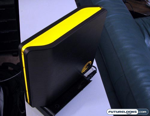 You might also notice that the Seagate FreeAgent Pro lacks any sort of physical buttons whatsoever. This isn’t to say that you can’t turn it on and off! Instead, you’ll notice that there is a touch-sensitive power “button” in the base. There is one other thing that I should note: based on the appearance of the drive, you would think that it would detach from the base, but they are permanently attached. Don’t try to rip them apart! The button isn’t illuminated like the rest of the case, so it is somewhat hard to see. It’s almost like someone forgot to make it light up as it would go perfectly with the rest of the motif and allow you to find it in the dark.