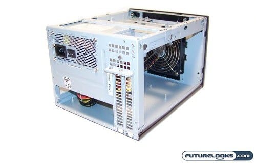 On the top left in the back, you can see the 300 Watt PSU. Its power specs are noteworthy. The 3.3V rail produces 20 amps, 5V rail 22 amps, 12V1 rail 16 amps, and 12V2 rail 14 amps. That’s some nicely allocated amperage where needed. It’s also why it can power a standard Core 2 series processor, 4GB of memory, and up to a GTX 250 video card. The unit is made by FSP Group (Fortron) and are known for making compact server PSUs for mission critical applications.