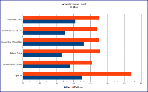 The SilverStone TJ04-EW manages to fall right in the middle of the cases I have tested so far. It is neither the loudest, nor the quietest in either category. There is one thing the test does not show and that is the type of sound. Some PC cases create a high pitched whine, the TJ04-EW has a low mellow hum. Its like comparing a 3.2 liter V4 to a 6.0 liter V8. Yeah the noise is just as loud, but one is much easier on the ears.