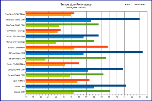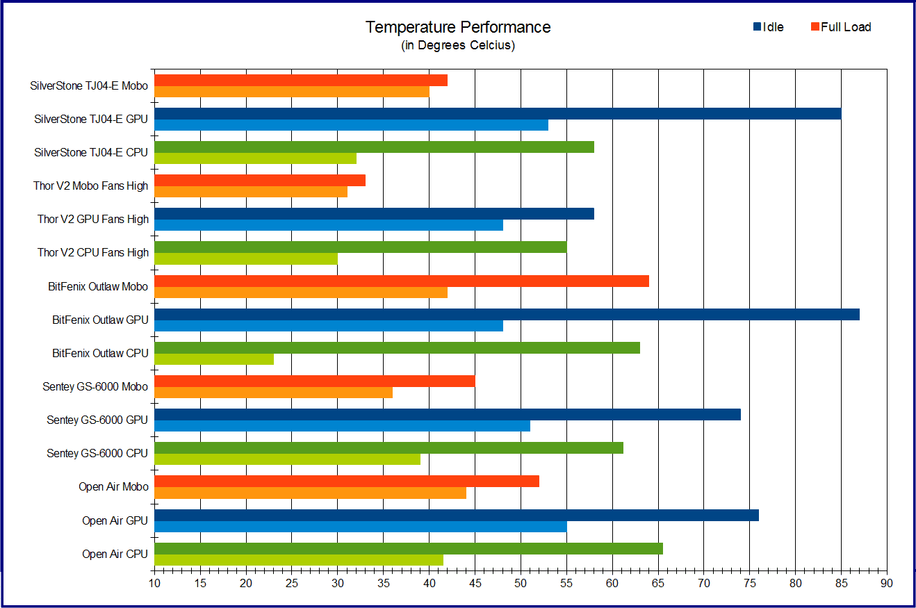 Much like the BitFenix Outlaw, the TJ04-EW seems great at idle with only the GPU being a little too hot. When switching to a full load scenario, the GPU suffocates which brings its heat up. I think the design of the case having no ventilation is working against it here. On the same note, I think this issue could be easily corrected with a single extra fan in the bottom of the case.