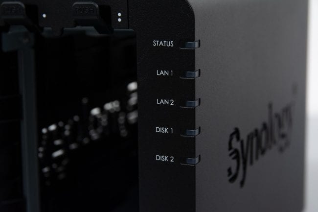 Also, along the front of the Synology DS220+ are the Status LEDs. These LEDs are relatively self-explanatory, but they are Status, LAN 1 and LAN 2 activity, Disk 1 and Disk 2 activity. You can quickly glance over to the unit and can tell if everything is working correctly or if something needs your attention.