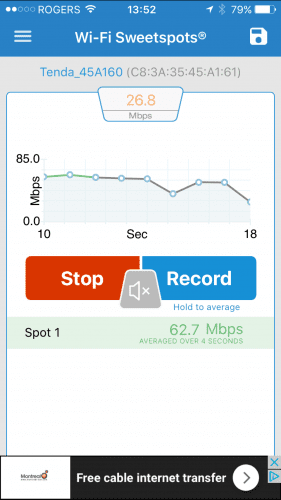When making use of an iOS app called Wi-Fi SweetSpots, we can check out what some average speeds can be had around the area. The environment the Tenda AC18 is being tes,ted in is very noisy with at least a dozen of other Wi-Fi routers and access points nearby. Those I have no control over so we will see how the Tenda AC18 can handle a noisy place.