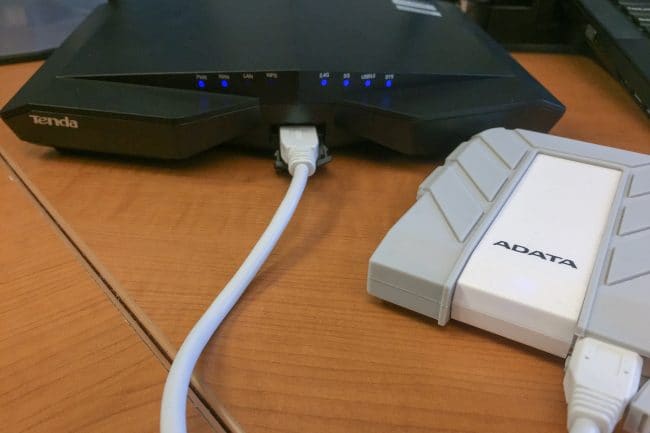The connector is right in the middle of the front of the router itself. Not the back with all the other connections, but the front. Depending on the device being connected, it may be hard to keep an externally attached device with a cable sticking out the front of the Tenda AC18. Imagine having a printer plugged in there?