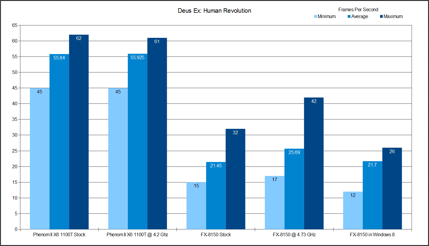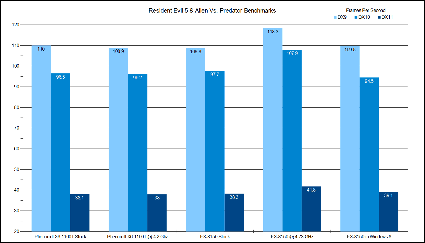 While the difference in performance is minor, it gives us a lot of information. First, overclocking the 1100T actually hurt its performance in every test. On the other hand, the FX-8150 has respectively large gains in every test when running at 4.73 GHz. At stock speeds, despite a clock speed and core count advantage, the FX-8150 falls just behind the 1100T in DX9. The FX does slightly better in both DX10 and DX11. Then when I switched to Windows 8 Dev. Preview the FX-8150 shows gains in DX9 and DX11 with a drop in DX10.
