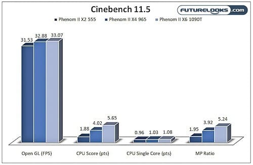 I was really impressed with the increase in the Cinebench 11.5 CPU test score overclocked. The overclock took it from 5.65 pts to 7.09 pts at 4.1 GHz. This puts it directly ahead of a much more expensive $949 Core i7 975 at 6.15 pts and right behind INTEL’s $1049 6-Core 980x at 8.64 pts. That’s definitely impressive for a CPU that’s less than one third the price of the Core i7 975. If AMD can get some better yields out, we’ll be looking at some hopefully stable 4.0 GHz six guns from AMD in the very near future at continued affordable prices.