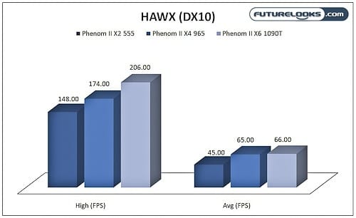 Our last game is the very pretty looking HAWX from Ubisoft. This game has elements of a Flight Simulator with huge maps and multiple bogies, missiles and other units that need a competent CPU to control, characteristic of an RTS. We’re hoping to see something from our extra cores in this test.