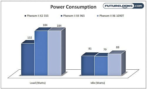 For the most part, games are a bust, but video rendering and other applications that provide heavy computational work loads relish in the presence of the Phenom II X6 1090T. However, if you’re a gamer that does make videos, rip music or do heavy graphics projects, having the extra cores might not be a bad idea, overall. The question is, will having the extra two cores suck anymore power? We took full system readings of our test system which each CPU to see what the impact on the socket is.