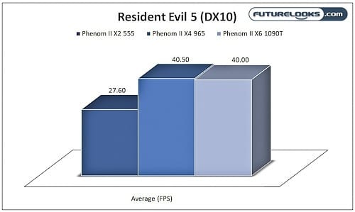 While we’re on a CAPCOM kick, Resident Evil 5 also supposedly takes advantage of multi-core CPUs. We run the DirectX 10 version of the benchmark to see if there are any benefits from going with extra cores of glory.