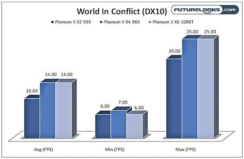 Real Time Strategy (RTS) games like World in Conflict not only have detailed graphics, but also a lot of units on the screen controlled specifically by the CPU. These games typically do benefit from more cores. Let’s see if that’s true.