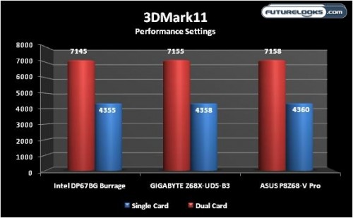 To answer this question, three iterations of 3DMark11 were performed on each motherboard using the same graphics. Using the Performance setting, averages are reported in the graph.