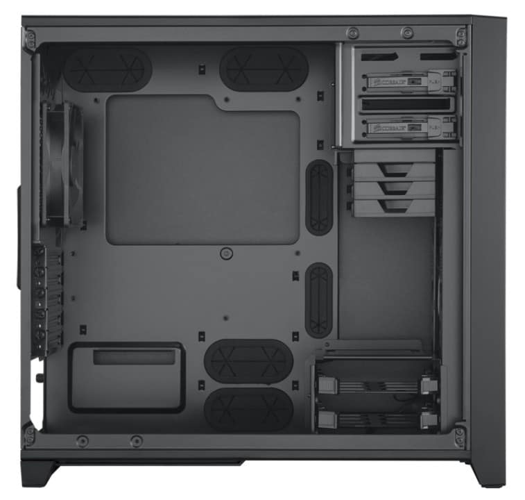 The Corsair 350D has the same black brushed-aluminum style as other Obsidian cases in the series. Going with a simple external design for sleek style, the 350D keeps its unique features for the interior. There you will find a pair of 5.25 ODD bays, 2.5″ SSD bays, and 3.5″ HDD bays. Its unique interior configuration allows for dual full-sized graphics cards. There is even a total of five fan slots with room at the top and front for up to a 240 mm radiator for the best possible cooling options. water or air.