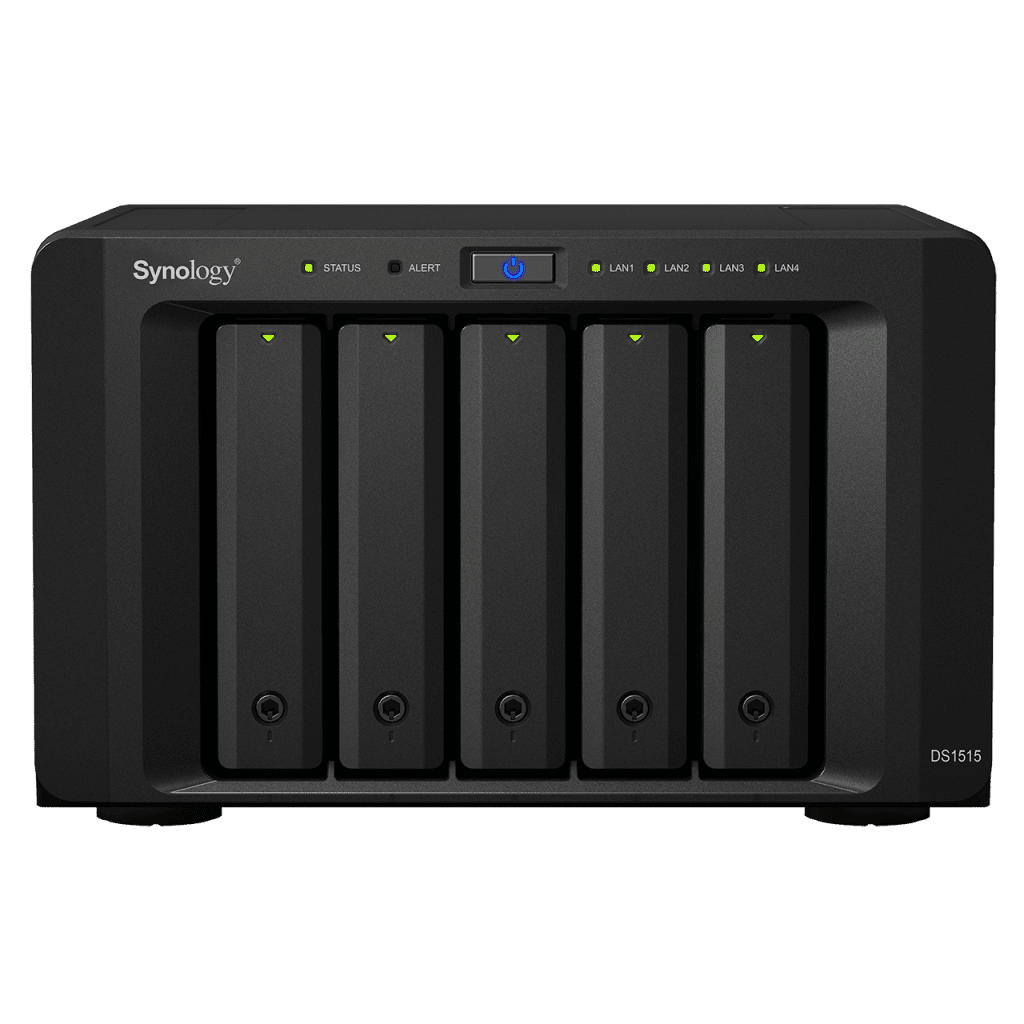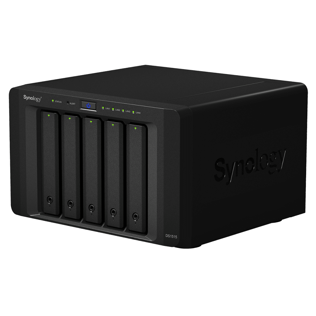 For small work groups and creative professionals; the DS1515 offers cross platform file sharing, remote access with mobile devices, and scalability to add storage in the future. Synology’s powerful DS1515 is the company’s first 5-bay Value series model with a quad core CPU, hardware encryption engine, and four built-in Gigabit LAN ports that can provide link aggregation for increased performance or high availability to minimize downtime. Individuals can also use the device for advanced, physical security for home and office.