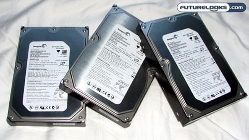 The assumption is that we will be able to achieve a higher level of performance using desktop-sized 3.5″ drives rather than the laptop-sized 2.5″ drives. As such, for the purposes of this review, we elicited the services of three Seagate Barracuda 7200.8 250GB hard drives.