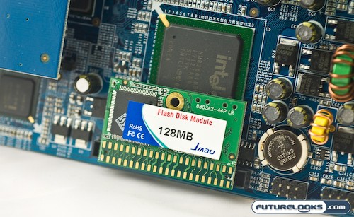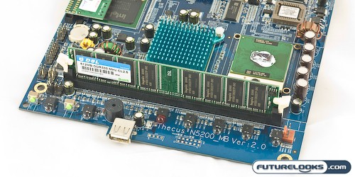 A few more seconds later, I had the guts layed out on my table and as suspected, it is definitely more computer than appliance. The system relies on a DDR 512MB memory module and a Celeron ULV 1.5GHz processor to power itself. A small cooling fan is attached to the CPU. Based on the modularity of these two main hardware pieces, you can see the upgrade potential built into the N5200B Pro. I’m sure people have attempted upgrades to a 2GB module and a Pentium III M CPU already. The board also stores its operating system on a 128MB Flash Disk Module plugged into an IDE header. The second Gigabit Ethernet port rides on a daughter card above the standard PCB.