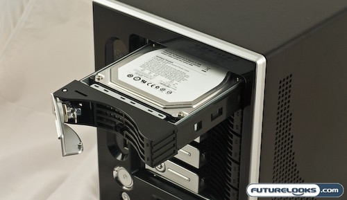 For starters, the drive bays are made of a combination of plastic and stamped steel trays. Even fully locked up in N5200B Pro, they jiggle. As we’ll find out later, even with drives installed, they still jiggled. Although if you leave it alone and don’t jiggle them, they won’t bother you, but there is an opportunity to introduce some vibration dampening into the drive trays. There was none, not even a thin layer of rubber to keep things vibration free. I also found it quite disturbing to see that the lock mechnisms could possibly be defeated by hand, potentially making the bays inaccessible to both you and the vandal.