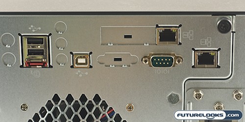 Moving to the back, you’ll see the main cooling fan including two additional USB ports, eSATA port, USB port for direct connecting the NAS to a PC (yes, you can do that) and the two ethernet ports. The lone legacy serial port is for use with some UPS devices. The powersupply is at the base of the unit and adopts a very rack server like appearance. It also incorporates its own fan unit so that if the main fan fails, the system will still operate and can affect a proper shutdown. The main power switch is also attached to it.