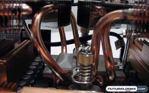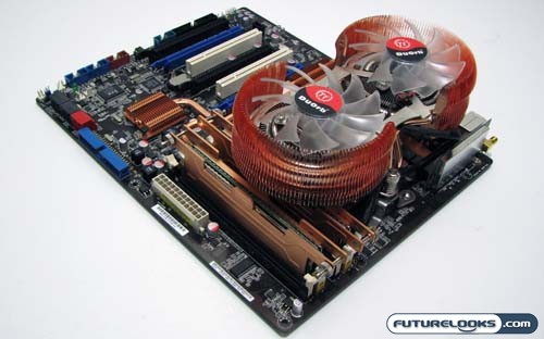 Other then some minor cabling issues, there was little problem with the fit of the DuOrb on our test motherboard or in our test case. The aforementioned brackets didn’t interfere at all with the motherboard-bound heatsinks of the installed RAM, though if you are using any modules with the raise heatsink design like CORSAIR Dominators or OCZ FlexXLC modules, you may want to rethink the purchase of this heatsink as it will not clear.