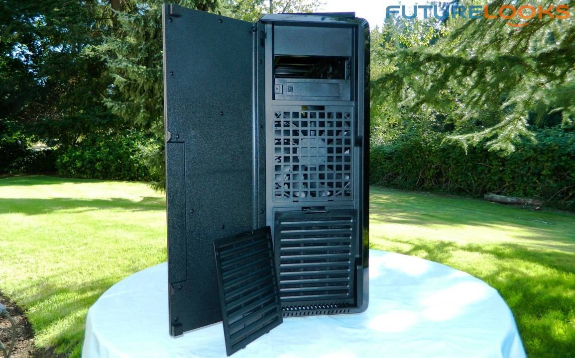 Starting from the bezel, the front door sports a gun metal finish. It’s self closing which is kind of a nice touch. The door as well as the enclosure all around is very light weight. Behind the door are single 5.25″ and 3.5″ tab locked bay covers. There’s no frame that has to be removed inside so just add your drives and tooless lock them in place. Below these are two removable front fan filters with intake fans behind them. This makes them very easy to keep clean.