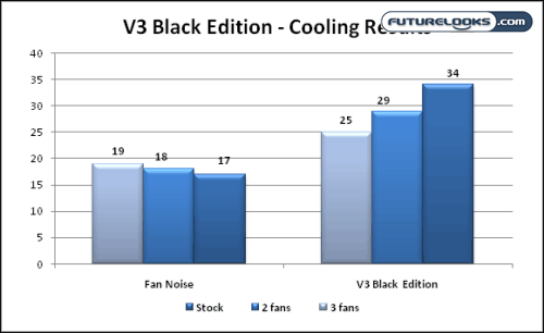 While running some PCMark Vantage benchmarks, the chassis internal temp was measured first with the single stock 120mm fan and then checked again at each stage as the front and top 120mm (60 CFM) cooling fans were added. Ambient temps were 22C during testing.