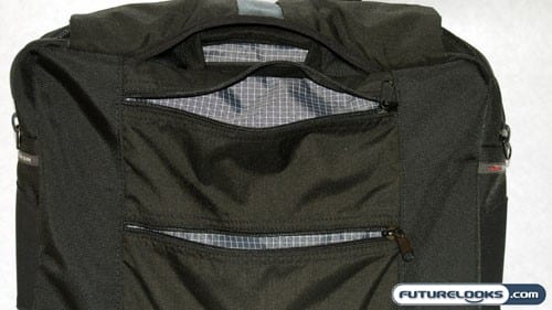The Checkpoint Flyer has a trifold design with the laptop case fitting securely between the front flap and the main compartment. On the front flap, you will find two contoured pockets that are secured with the familiar YKK splash-proof zippers. Inside each pocket you will find one of the “o-rings” that are designed to use a variety of clip-on accessories, such as the key strap that you will find included in the larger of the two pockets. The top-to-side zipper design allows for easy access and makes these pockets a great place to store items such as a small book to read on the plane, power cord and mouse for your laptop, and your cell phone. However, these pockets are not padded so be sure to use caution when deciding what items you will keep in these front pockets.