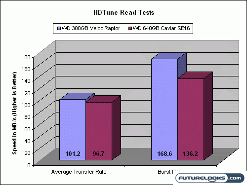 This interpretation is further reinforced by the difference is Access Times (aka seek times) between the two drives. The 640GB SE16 nearly doubles the VelociRaptor in seek times, which would lead to those higher burst rates. This means the drive has the ability to perform well in an environment where there is access to many small files in spurts; an environment like that of a gaming or performance computer system.