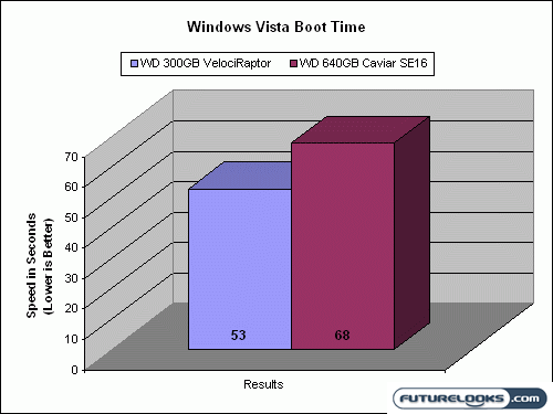Finally we decided to see if the VelociRaptor could reduce the length of the dreaded Windows boot time. The stop watch was run from the pressing of the power button, to when Windows was loaded and the hard drive light was off. This boot up includes drivers for all the hardware, and a couple utilities used in test. Even with all that, our test bed with the VelociRaptor installed managed to boot into Windows Vista in under 1 minute. The exact numbers translate into a 22% performance boost in favour of the Western Digital VelociRaptor 300GB hard drive.