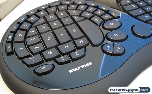 As noted before, the Wolfking Warrior Xxtreme has a dual personality. One side is configured for movement in 3D games like shooters and MMOs, and the other has a full complement of keys in a split QWERTY setup. Along the top are audio controls, an Escape key, some extra functions, and lighting control. As for the finish, it’s the same smudge prone piano black.
