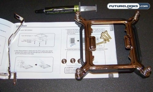 The manual was clear on which LGA1366 components to use. The black bracket was a little loose even with the washer and screws thoroughly tightened. We figure the motherboard’s PCB is just a little thinner than the boards Zalman’s engineers used in development. While it shouldn’t affect performance, we didn’t want to take a chance, so an extra washer was added to each bottom bolt to tighten it up nicely.