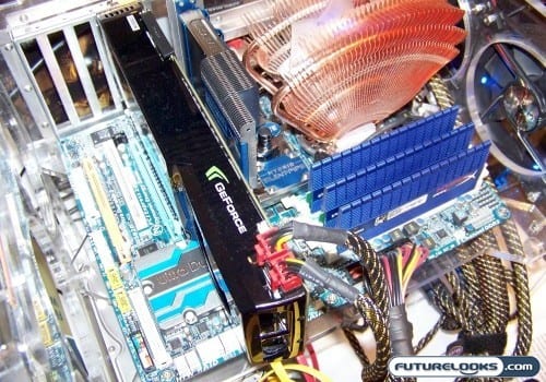 The ZOTAC GeFORCE GTX 275 is a fairly decent sized card so in addition to making sure that it clears everything, and make sure that it sits in the slot all the way. You can tell that it’s installed right by making sure the PCI frame of the video card sits down on the I/O PCI frame of your case. Anything less and you’ll likely encounter all kinds of issues. Other than that, just make sure your power supply is up to snuff and that you’ve got two PCIE connectors (or use the MOLEX adapters) and you’re set to go. If you don’t have a decent power supply, you’ll know because the drivers will taunt you with a popup screen, underclock your card and the performance will suck.