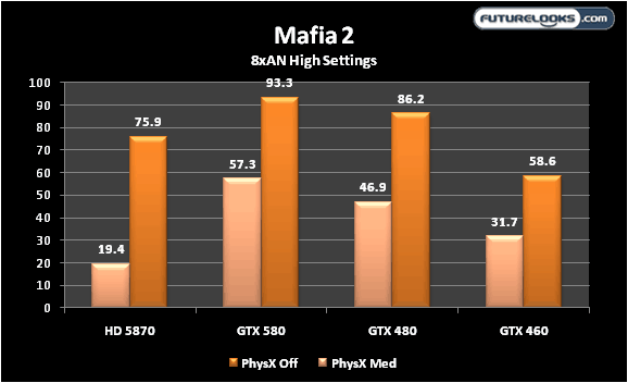 Mafia II is another game title that features a rich PhysX environment. It’s been known to slow down some good performance graphics cards at higher resolutions. This means, we shouldn’t expect much from the ATI card.