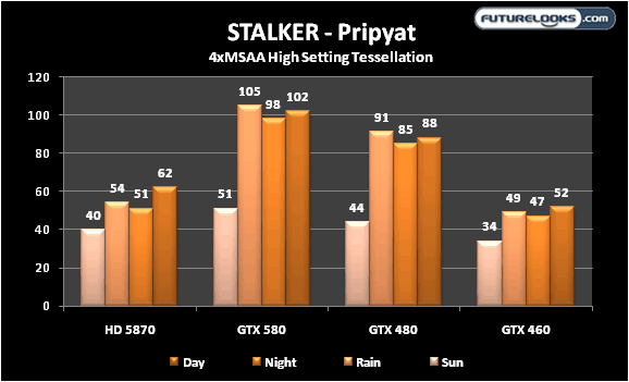 There was a change of colors here. The NVidia cards all out performed the HD 5870 which seemed to have more trouble with the flames. Of course, the GTX 580 enjoys a strong 12 frame per second improvement over the GTX 480. Pure pristine country driving is what you’ll get.