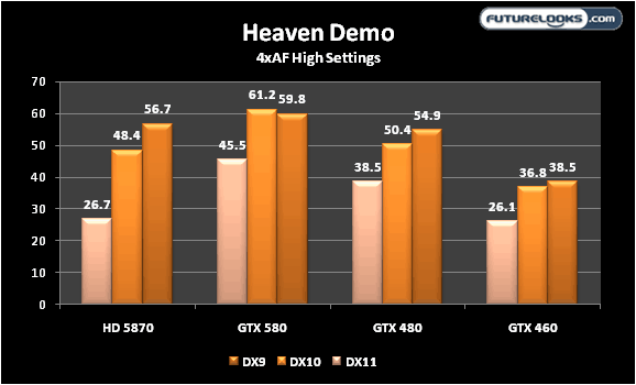 Heaven is one of my favorite benchmarks since it’s free and so easy to use. It gives us the option of testing all of the DirectX formats without needing any extra software. While DX9 and 10 don’t hamper performance too much, DX 11 Tessellation along with 4xAF really utilize the video cards’ resources. These are the fastest frame rates to date. And, even though it’s only about 4 frames faster than the GTX 480, it still is a testament to the improvements inside.