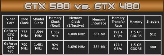 If you recall, the GTX 480 rocked 480 Shaders. The GTX 580 however flexes the full 512 Shaders where Fermi was originally headed before heat and power consumption became an issue. This should mean more performance. But, rather than bore you to death with the entire list of specs improved within the GTX 580, here is a handle little ZOTAC table comparing the two GPU:
