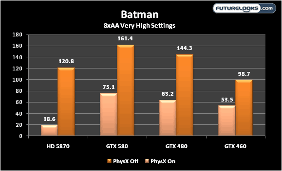 This game is also heavy PhysX favourite and the poor HD 5870 just creeps when enabled. Basically, any AMD GPU hits a wall at 19 frames per second. Even the newer HD 6800 series. The NVidia line does well even the GTX 460 with an 8xAN setting applied at the chosen 1920 x 1200 resolution. Of course, GTX 580 is well ahead.