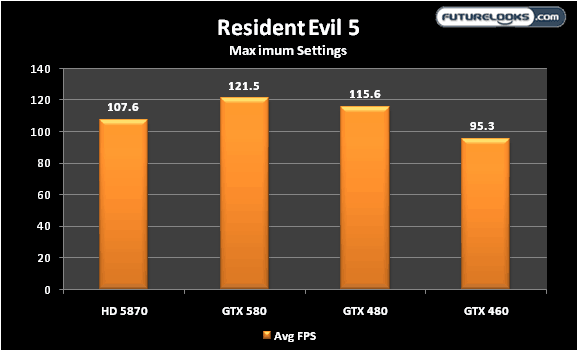I picked Resident Evil 5 because it’s one of the very few DX10 free benchmarks around from CAPCOM. In rinse and repeat fashion, the GTX 580 leaves everything in the dust using the benchmark’s maximum settings at 1920 x 1200 resolution. This time, the HD 5870 makes better use of its GPU. Still, the entire NVidia series seems to enjoy this title.