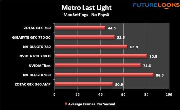 Metro Last Light sucks the living memory bandwidth out of any video card. Given the benchmark’s tough details, the ZOTAC GTX 960 AMP! performed admirably, again, coming close to matching the GIGABYTE GTX 770 OC.