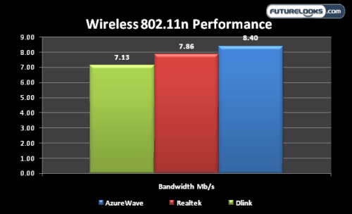 I compared the wireless throughput couple different 802.11n wireless devices to the AsureWave mini-PCIE device that comes installed by ZOTAC. The Realtek (8191SE) and DLink wireless adapters are two typically found in capable laptops. ZOTAC’s solution is noticeably faster and will handle 1080p streaming.